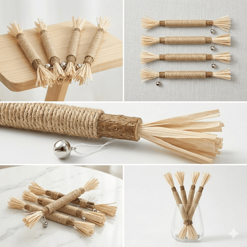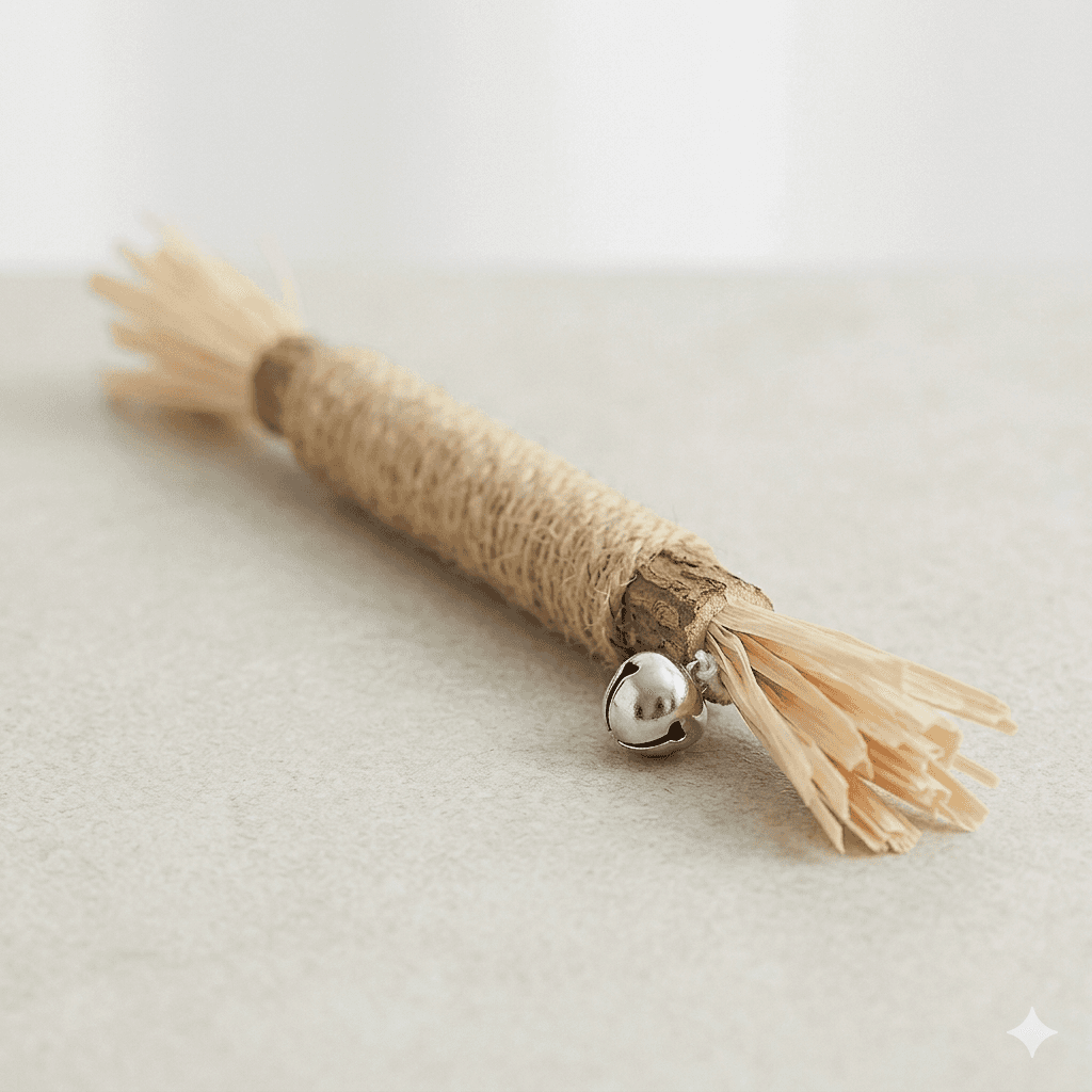 Organic catnip spray + natural sisal sticks. Spray on toys or bedding to reignite interest. Sisal sticks provide dental benefit and tactile stimulation.