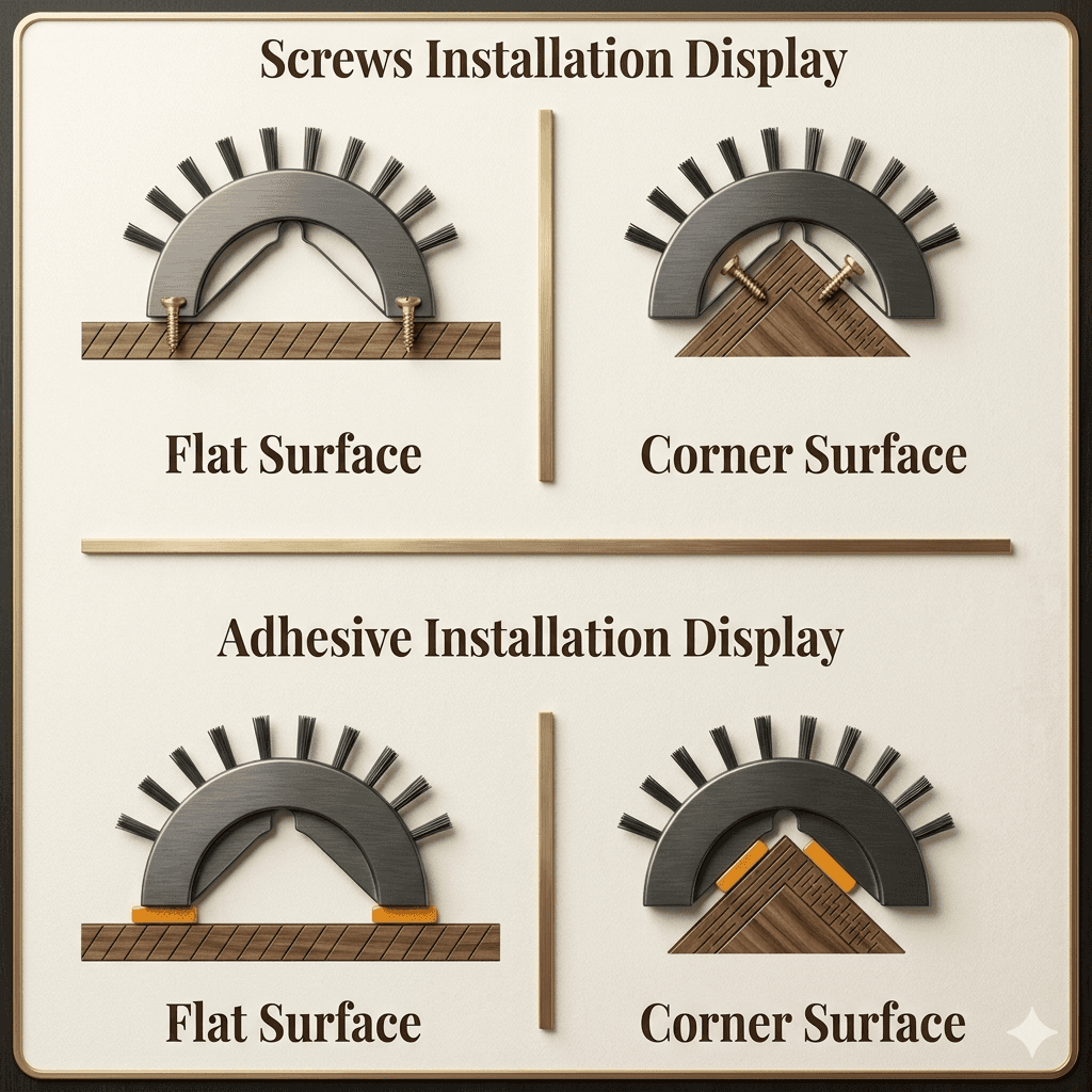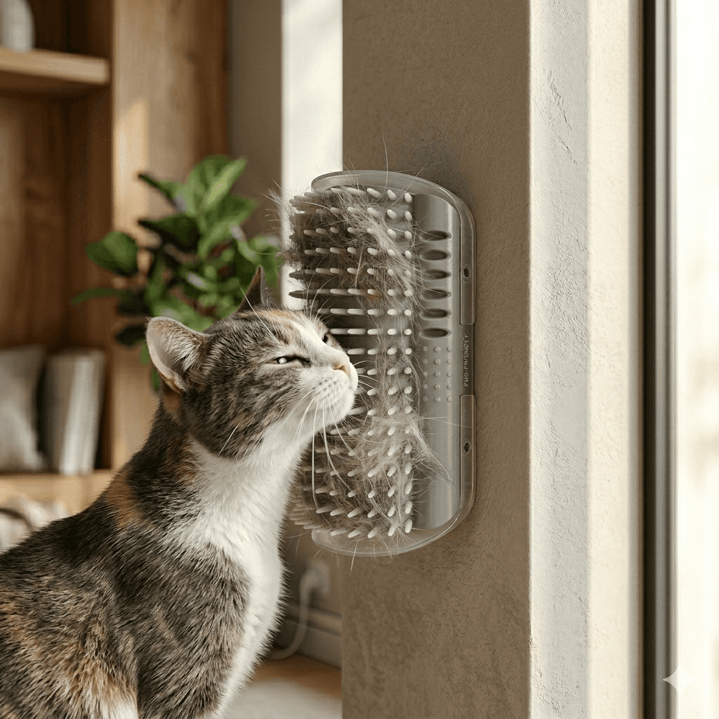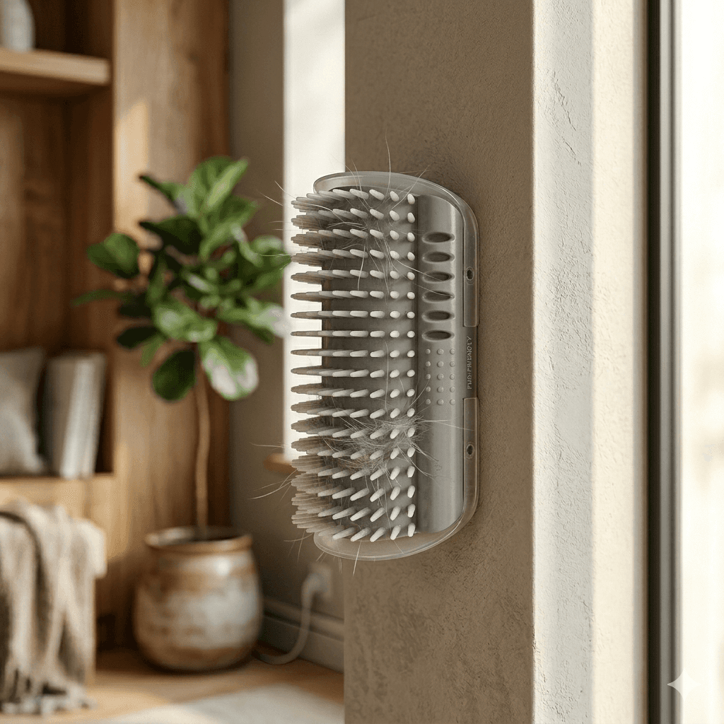 Flexible bristle brush that attaches to any wall or furniture corner. Removes loose fur, massages skin, satisfies grooming instinct.