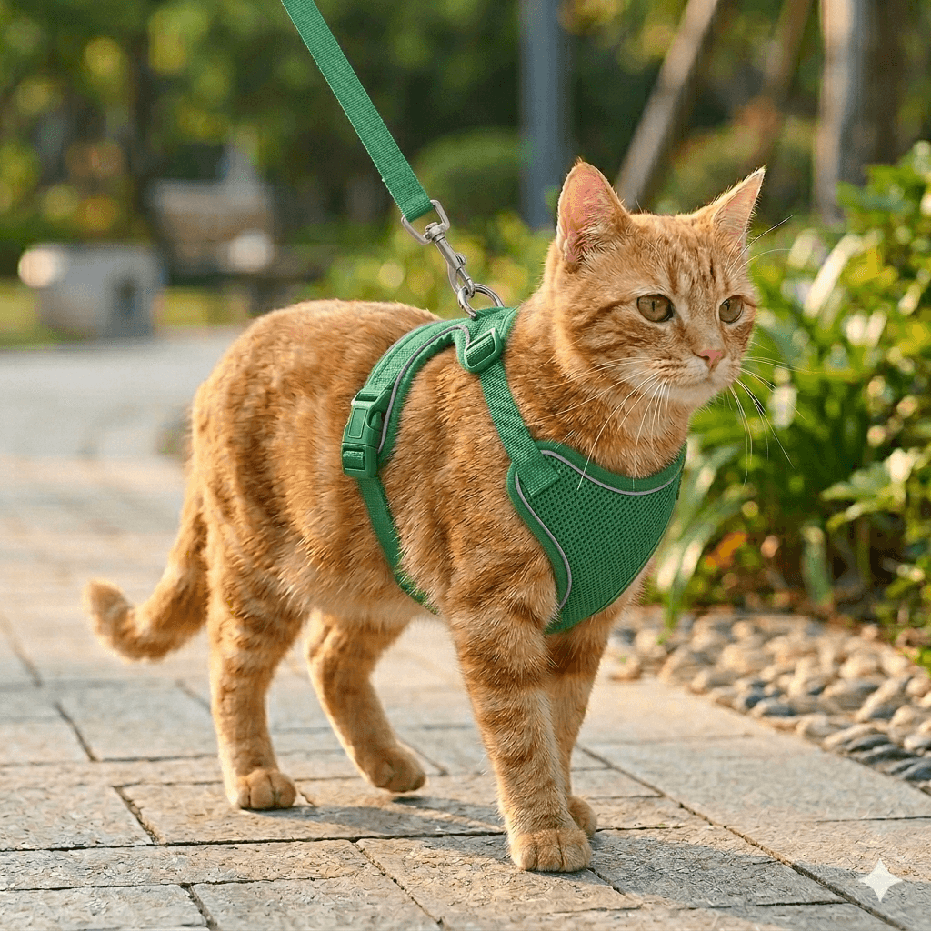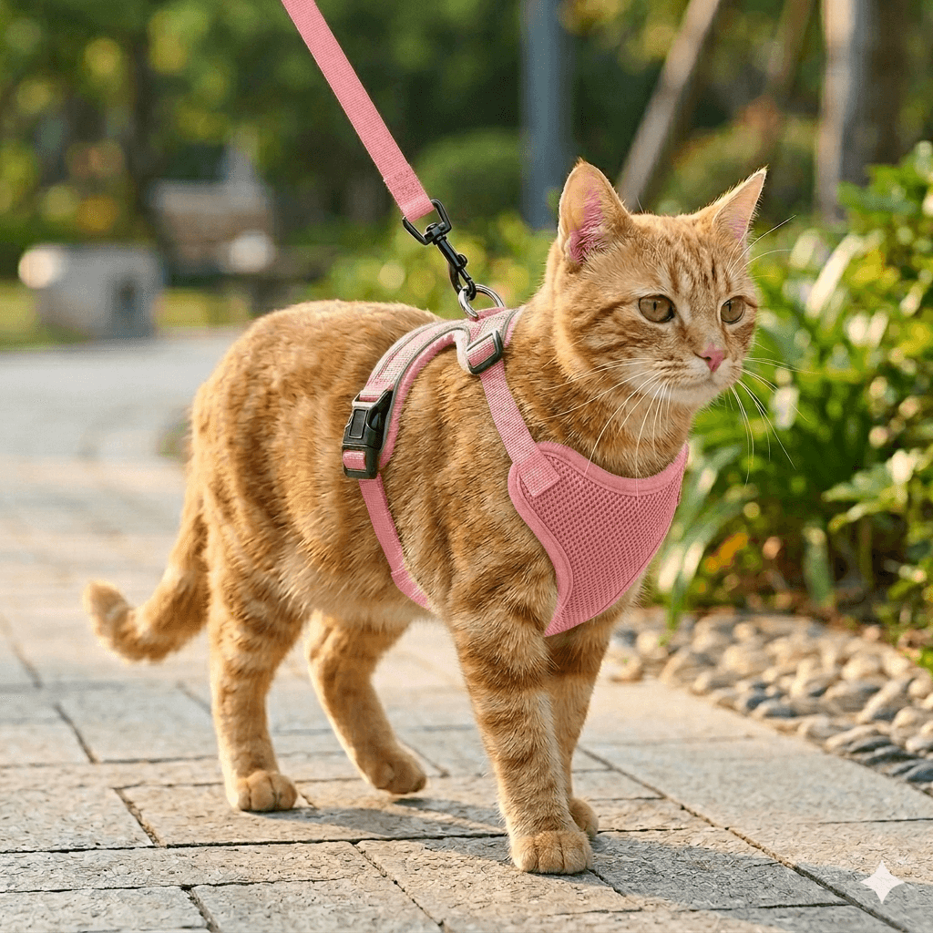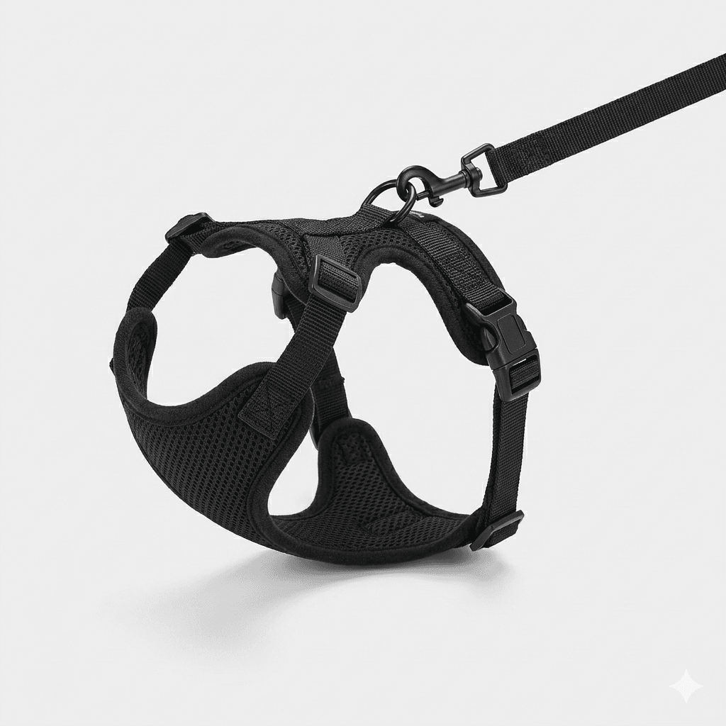 H-design harness distributing pressure evenly. Breathable mesh fabric. Fully adjustable for cats over 3kg. Secure clip buckles.