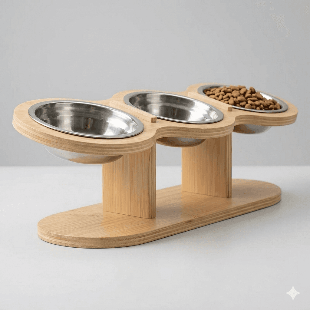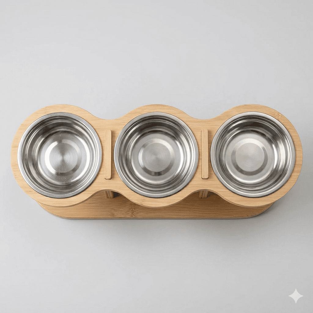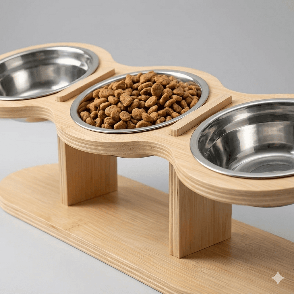 Elevated stainless steel bowl set improving posture during meals. Rust-proof, dishwasher safe bowls. Non-slip base. Minimalist stand.