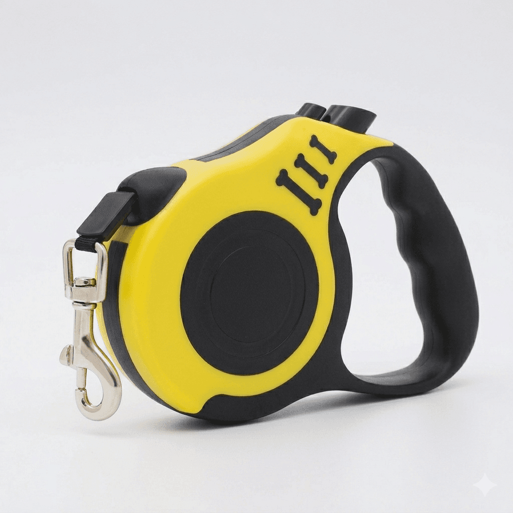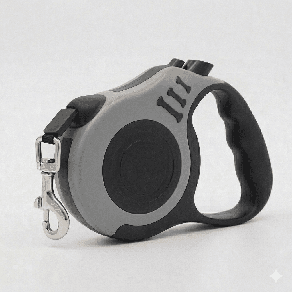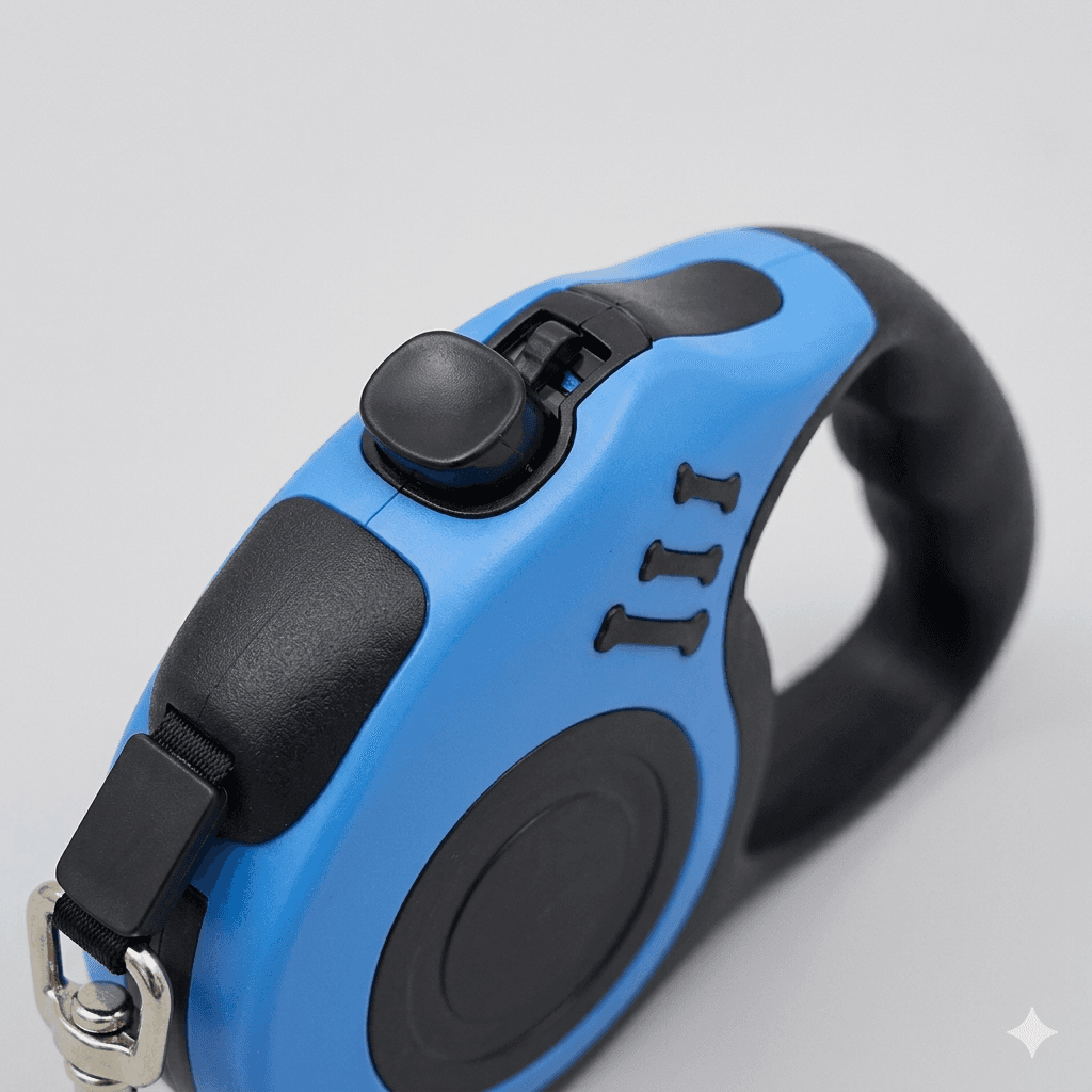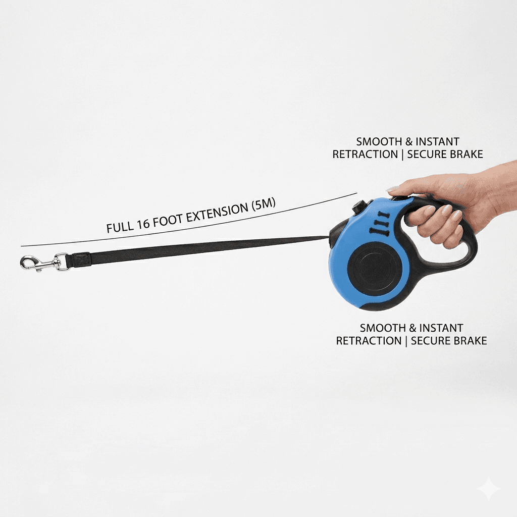 Up to 5m retractable cord with one-click brake and lock. Ergonomic anti-slip handle. Reflective strip full length.